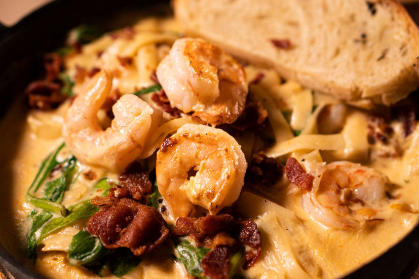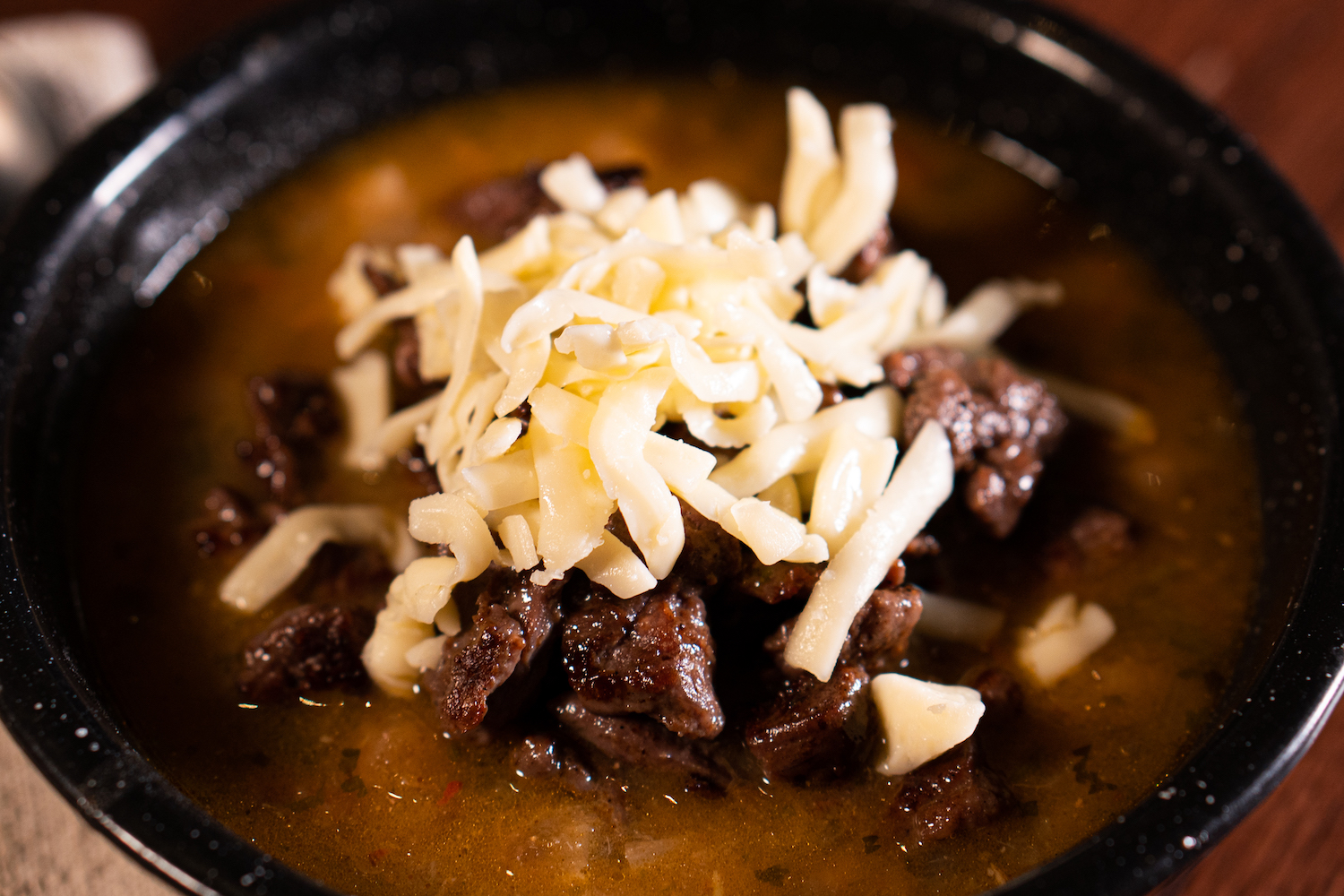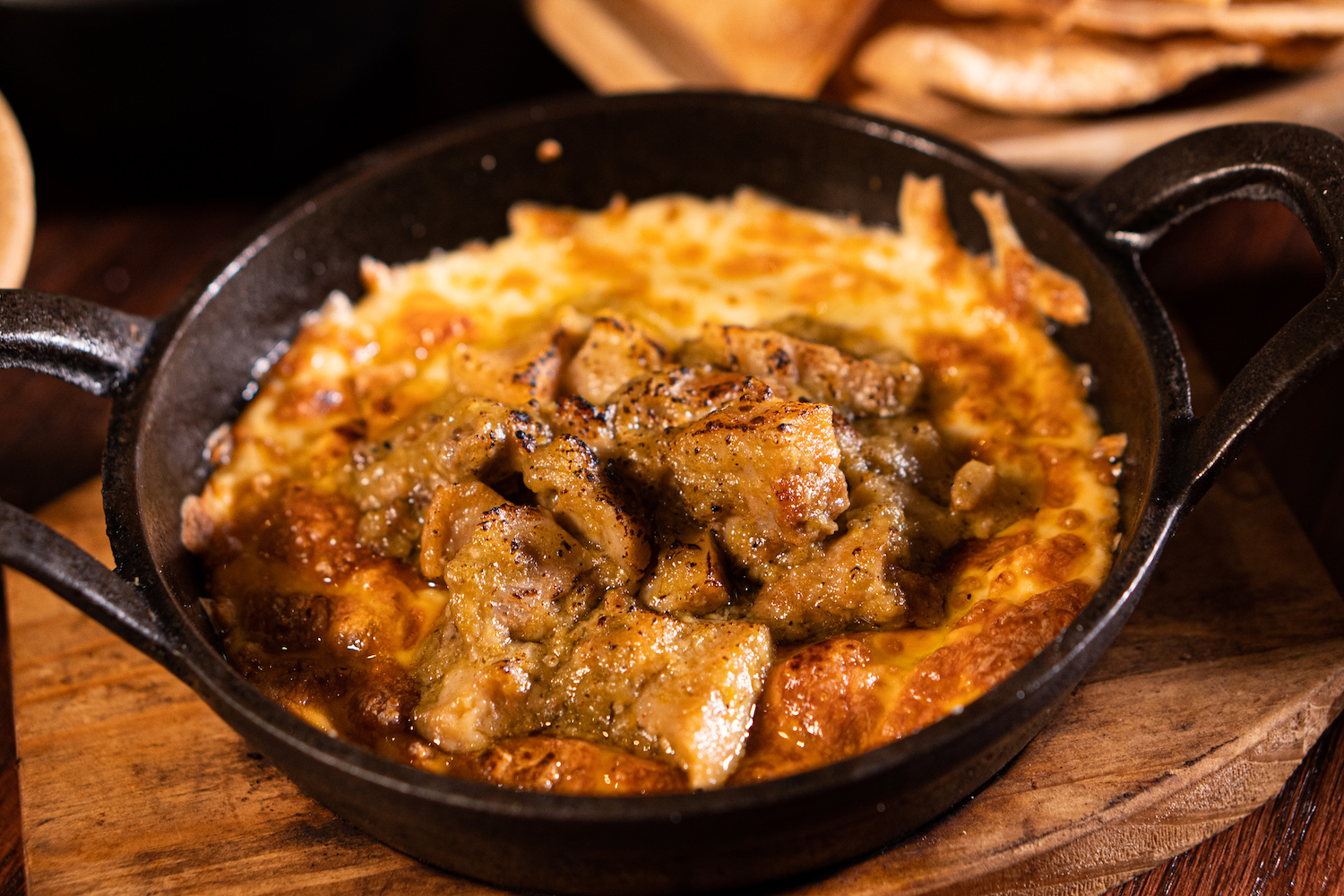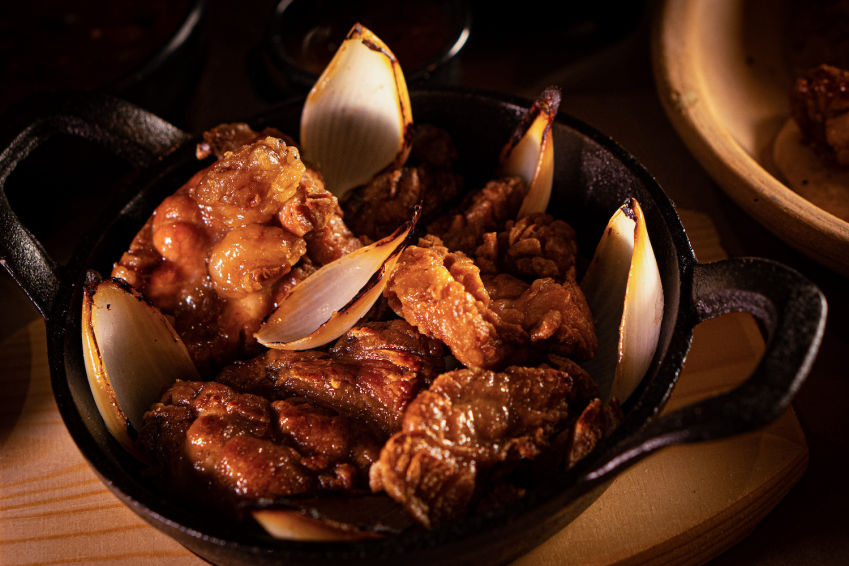 Queso Fundido con chicharrón en salsa.