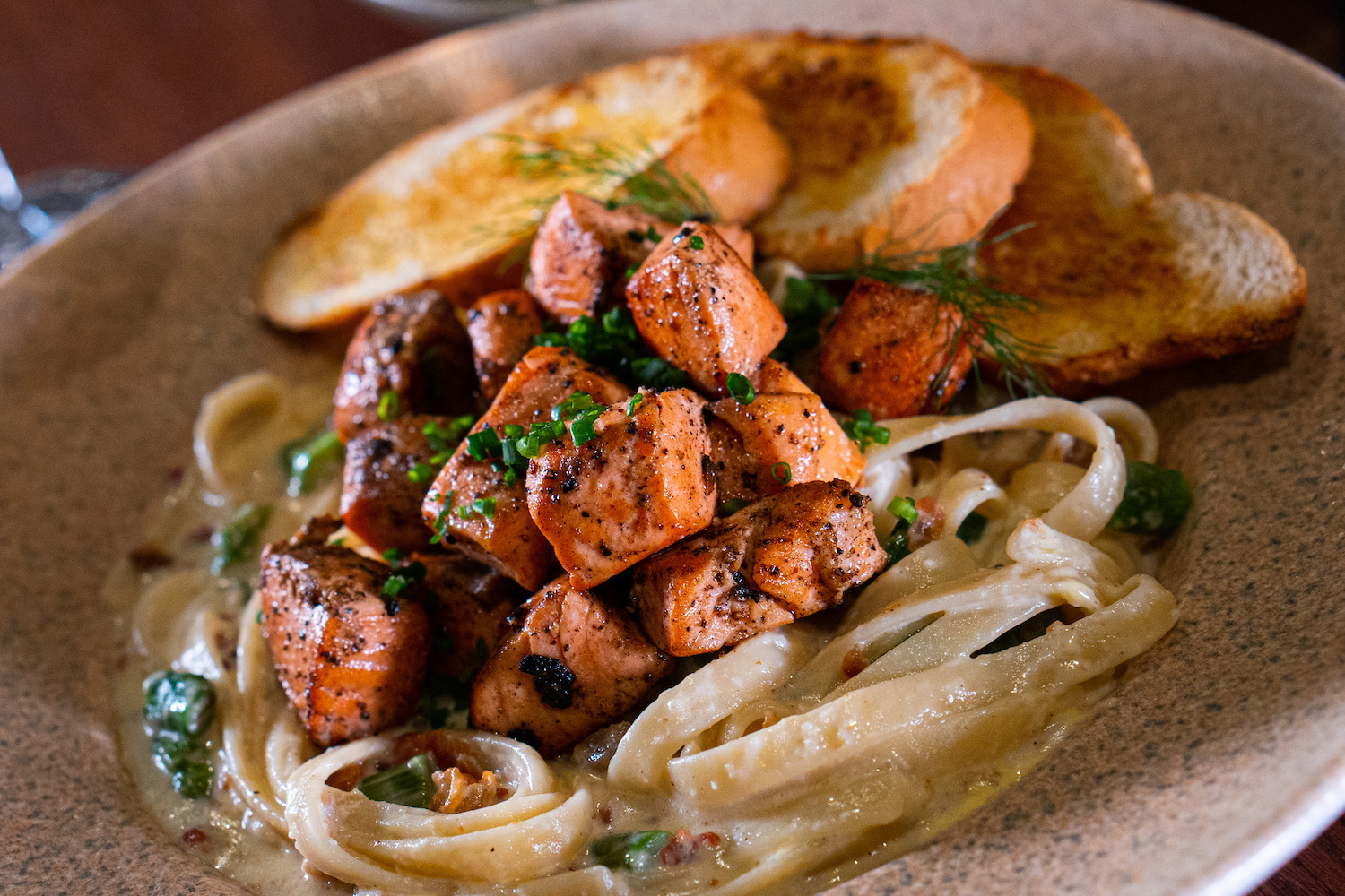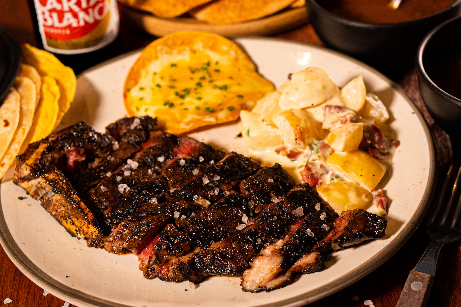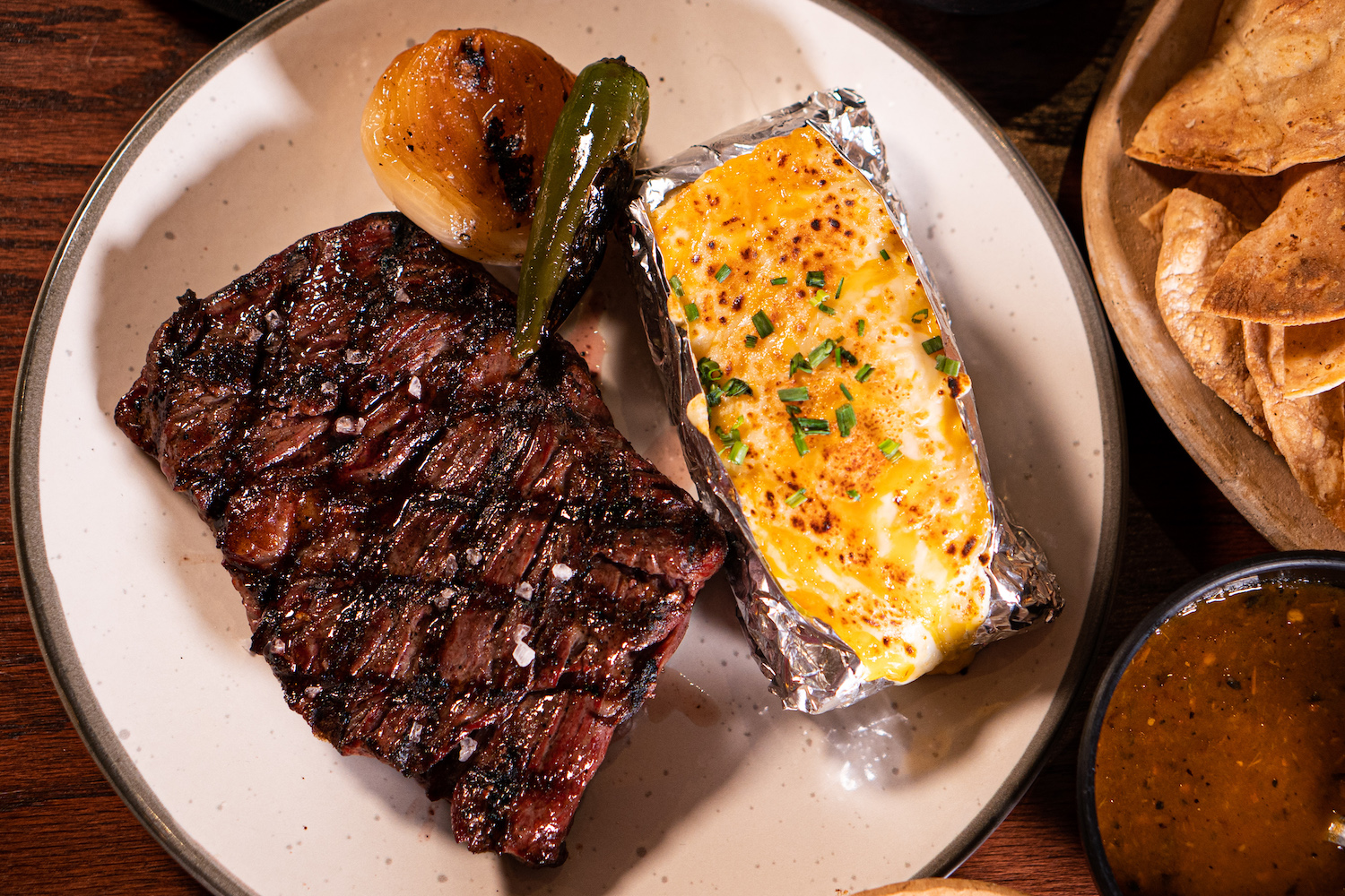 Papa asada con carne y tostadas